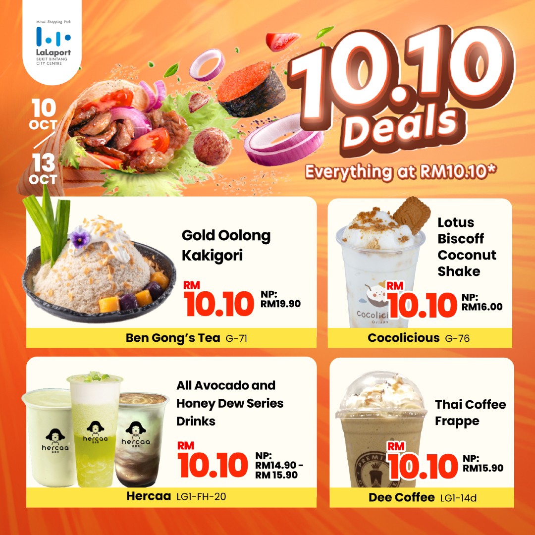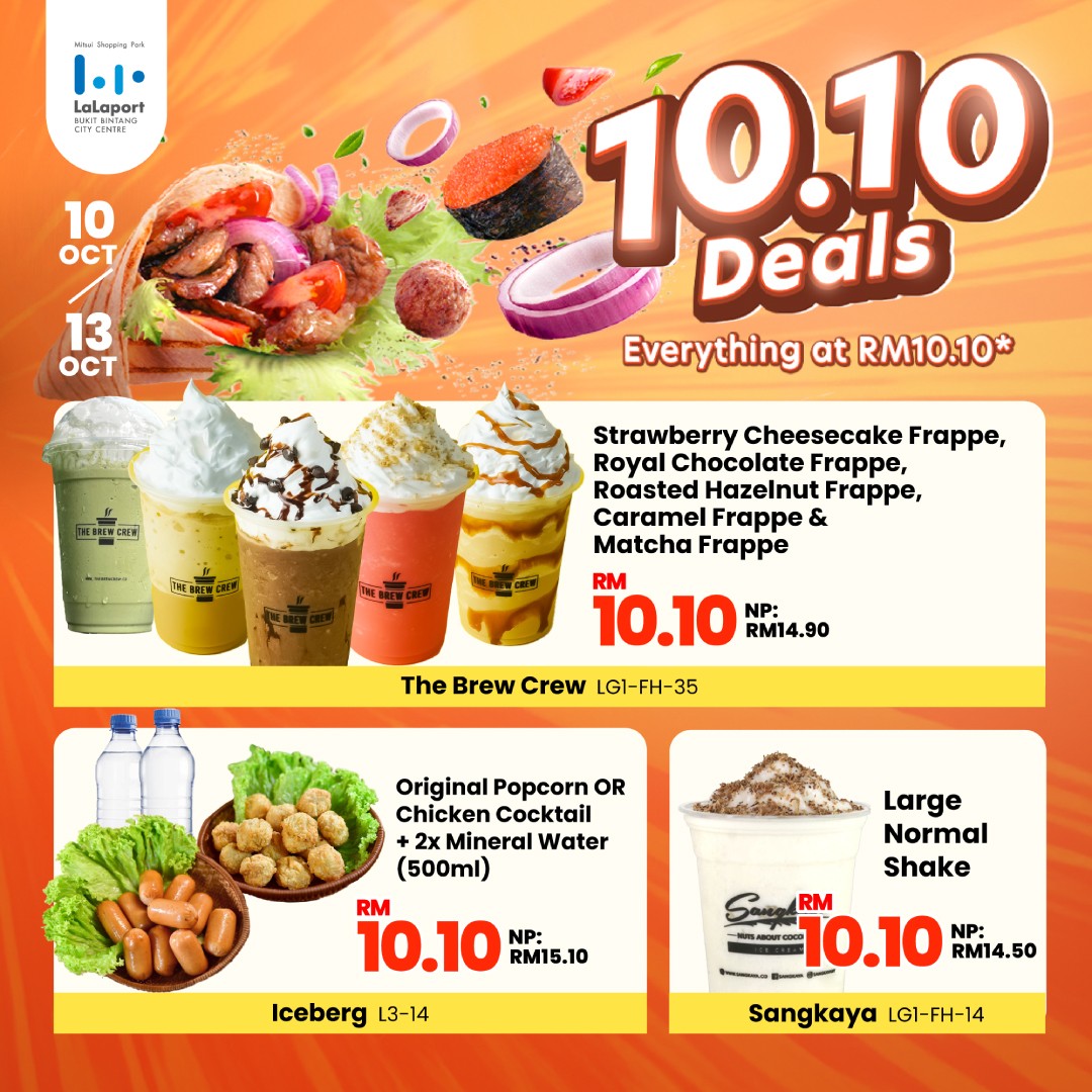 Double the date, double the fun! Mark your calendars for the 10.10 Deals at LaLaport BBCC! From October 10th to 13th, enjoy exclusive deals with everything priced at just RM10.10. Whether it’s a delicious coconut shake, a mouthwatering meal, or your favorite snacks, there’s something for every craving.